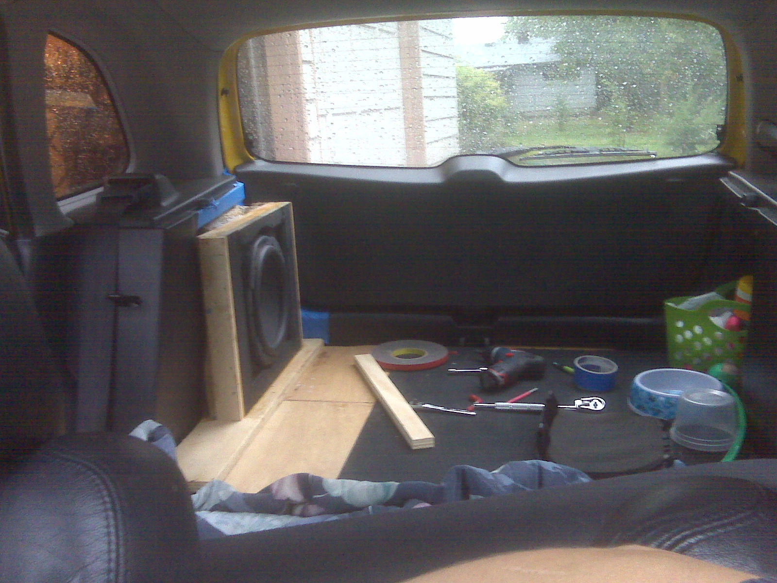 i know you guys have been loosing sleep waiting for the progress of the box heres what i got so far. i built a wood frame that counters to the floor line. i can also mount a normal baffle to it when i'm done. messing with rings and finishing the front fiberglass isnt something i love doing.