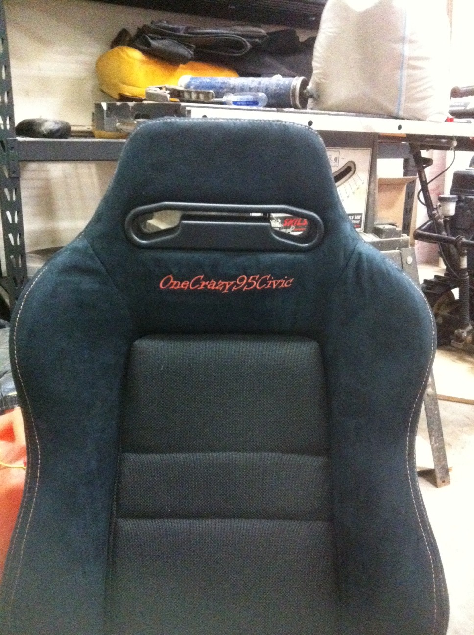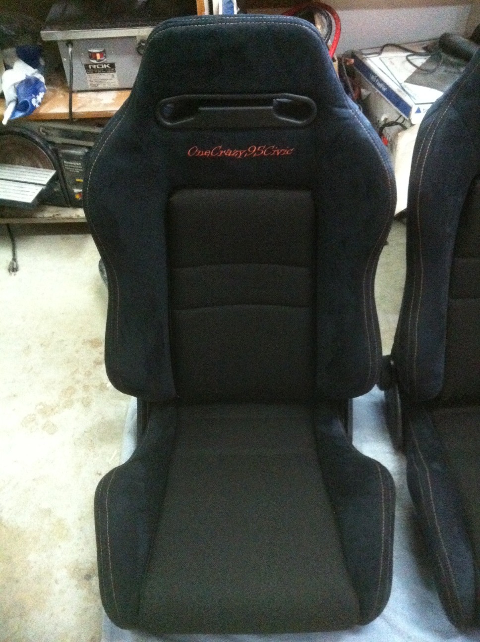 Just got back my 20 years old JDM RECARO Honda civic seats from the upholster shop and I am loving it. Thank you Mr. Bergeron for again the excellent job!!! The seats use to be red with black stiches and got them recovered in black suede with orange stiches which will match the dash. As you can see I replace the RECARO logo with the name of the project instead…OneCrazy95Civic…I feel this was appropriate considering it is a crazy civic project…lol!!!