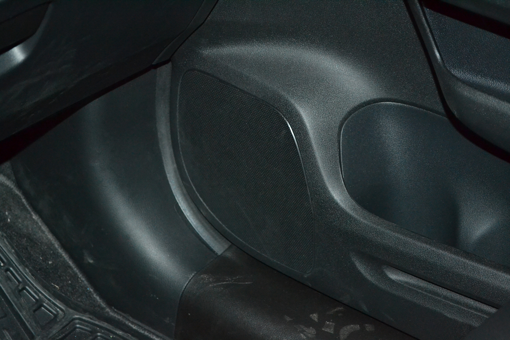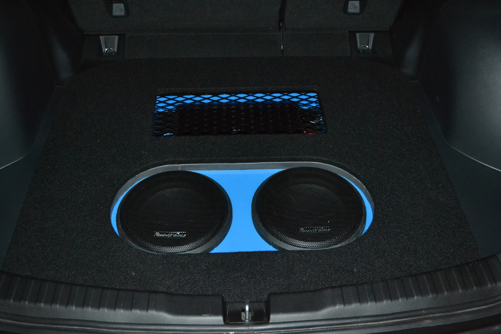 The whole team had a hand on the install, but Benny Broyles built a custom fiberglass and MDF sub enclosure/amp rack in the wheel well that looks amazing. This had to be rugged enough that it had to withstand whatever heavy crap got piled on top of it. I read a horror story on another board where a guy's wife poked a hole in the cone of a Morel Ultimo with some sewing gear she was hauling. I didn't want to be that guy. Speaker grills cover the subs, which are recessed down into the wheel well, and the amp is covered by a steel grate. All of this is covered by the black plastic tub thing my wife insisted on keeping, and together they protect the gear very well. My wife is, well, let's just say she isn't a huge fan of car audio. After I brought the car home she was taking pictures of the subs/amp and texting them to her friends. I guess she likes it.