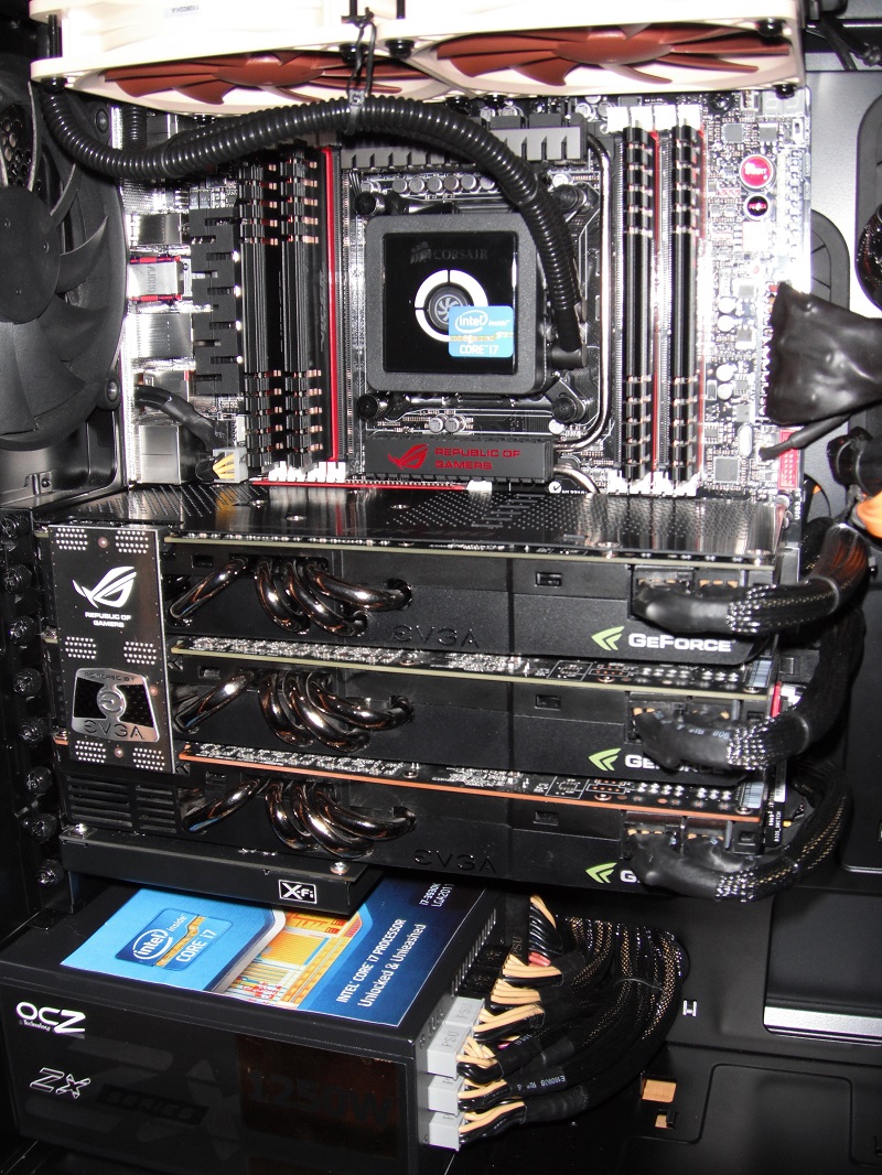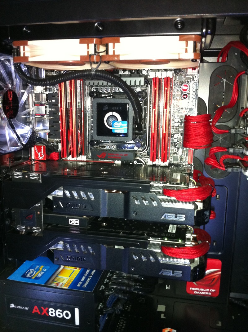 I have but a single EVGA GTX 680 in mine, but it still cranks out the heat. I had a pair of GTX 460's, but one of them failed and went and got the 680. I threw the good 460 back in and ran it as dedicated physics. I figured, I had it, might as well use it for something.