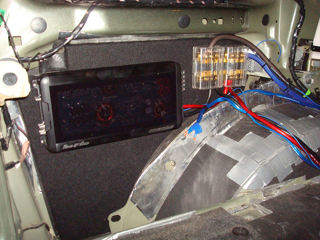 Now I'm going to run the tweeters and mids off of my Xenon 200.4 and run the woofers and sub using the SD1300.5. I decided on the Xenon instead of the 500.4 just for the extra power for the 8 ohm mids.Here are a few pics. I managed to squeeze the big Xenon behind the panel in the rear of the vehicle
