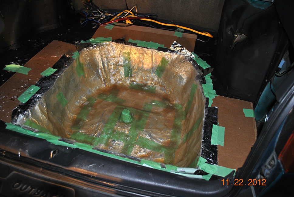 I figure the enclosure being in the well will stabalize it overall, these are there to keep the fiberglass from bending out of shape while it is out of the car & being worked on. My other fiberglass box was bent out of shape some & didn't fit as molded when I put it into it's spot...had to pound the well in some & force it into place! Didn't want that happening again, the MDF & car should brace it pretty damn good.