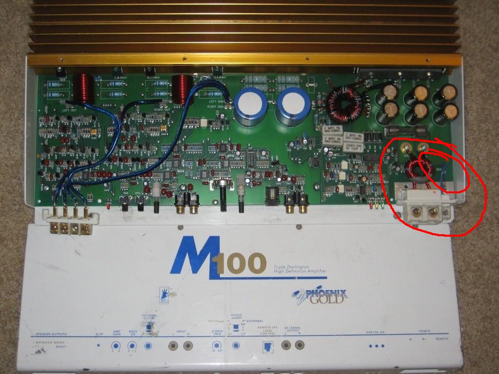 The bottom pic is 1 of my my M100's I believe, Eric modded it like that the originals have 6 caps. I have a brand new speaker terminal here it's black though. You could dye your power terminal black to match.