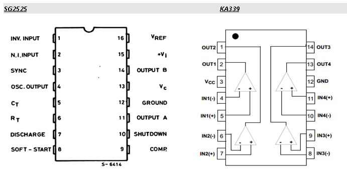 They both have the correct input voltage, about 12.7V (car battery power) measuring pin 12/13 on SG2525 and pin 3/12 on the KA339.