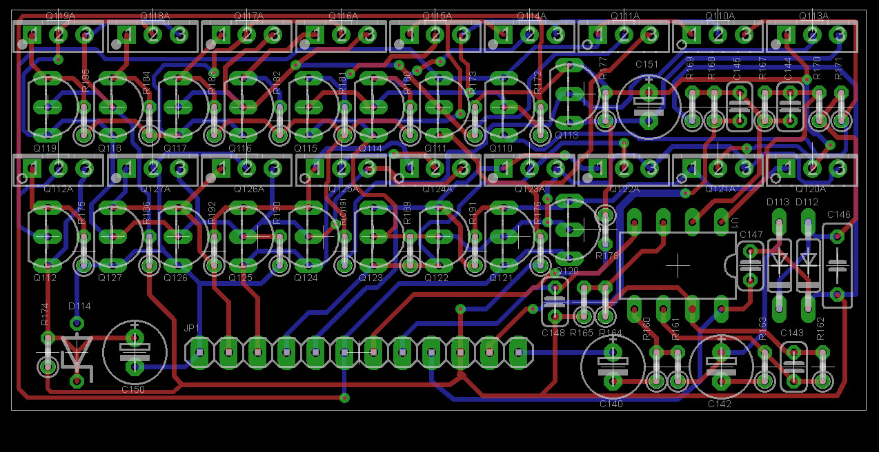 The attached screenshot is the board layout for a modified driver. The board ended up having to be about .3" taller. I think I could get it back down to the stock footprint if I used SMD, but I also think this will fit in the majority of amps. The KSA1220A/KSC2690A will be in horizontal rows on the board, basically perpendicular to the original TO-92 parts. With the TO-92 locations unpopulated, there should be room to heat sink the transistors and hopefully increase reliability. I think I am going to submit the design to oshpark tonight, I'll probably start with the minimum order until I am sure the upgraded parts will work.