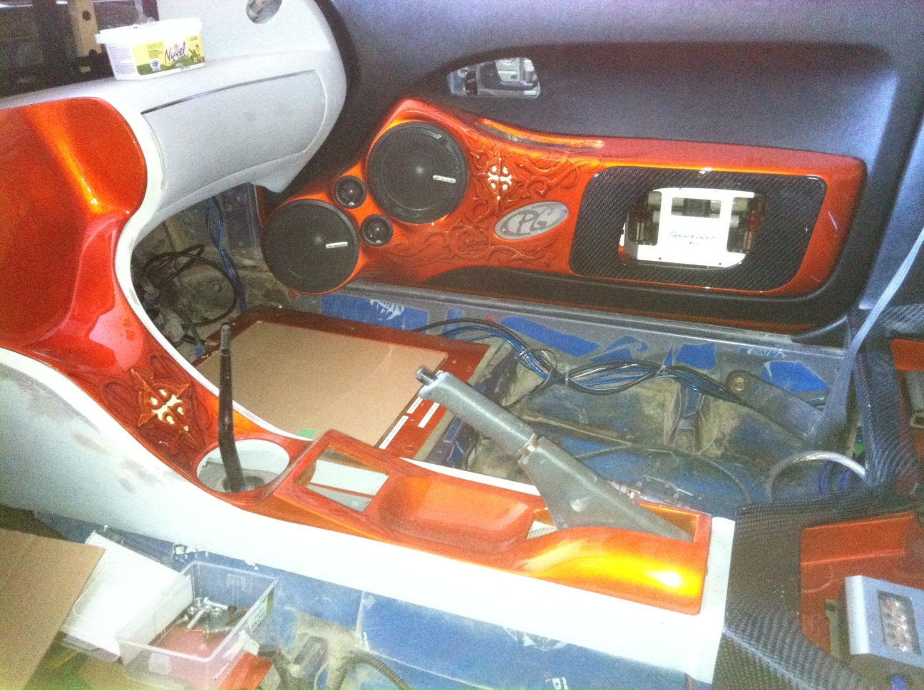 You're absolutely right, it's has been a while since I last posted pictured. Well to be honest I got saturated with the stereo install so I took most of summer off the project but I wasn't totally at idle. We got the suspension, brake conversion to an Acura type R and all the re-routing of the brake components and custom brake lines completed. Last week got back on the project itself (stereo) and here are some pictures, just got everything back from being covered, i.e. door panels, rear panels, etc… the dash is now gone to get covered and should get it back by end month. Also I’m re-shuffling a little bit the rear lay-out, not by much, just making it more to my liking which means I have to wait for some trays to get back from paint (pics to come), also I had to re-do the Powercore area it wasn’t to my liking. You can see some of the early stage of the work in the pics below. The wiring of the system is also a nightmare, wiring 3 PG Reactor amps that are motorized is not as easy as someone might think and add a motorized trunk that house numerous PG components makes it even more challengingLux wrote:Any new pictures?