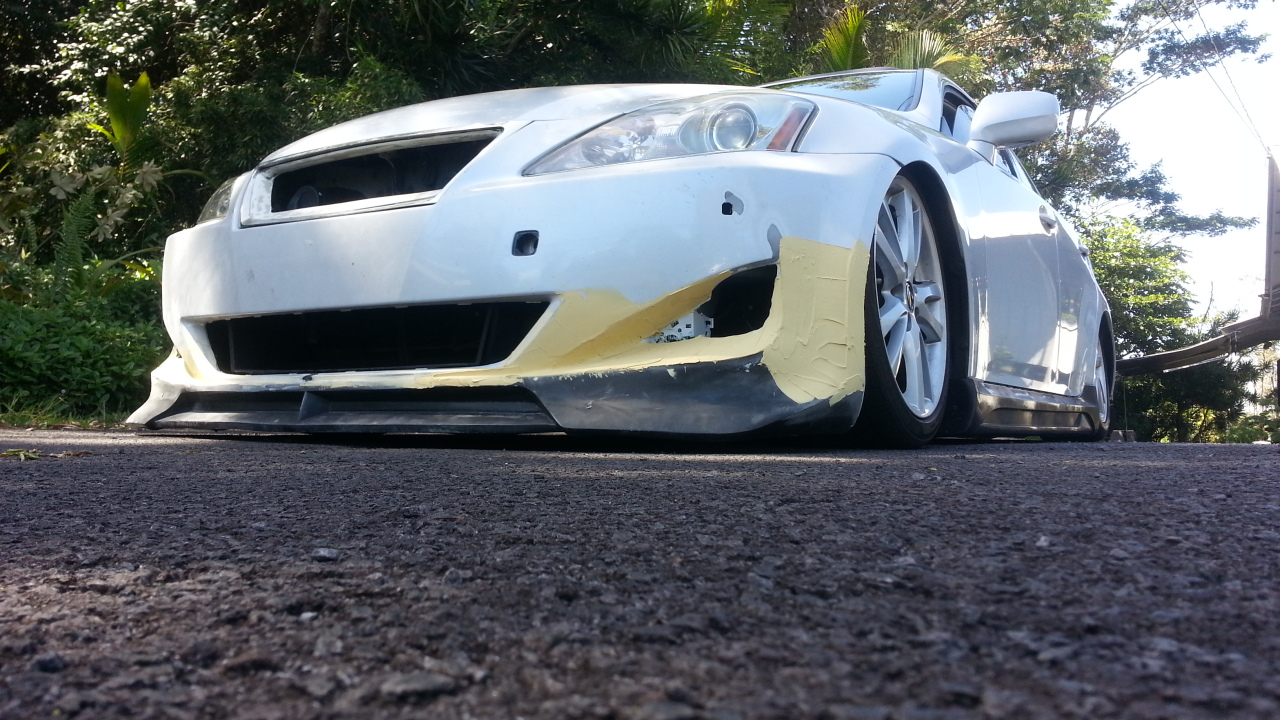 hello been busy with other things but i started molding my front bumper and modifying my grille. side skirts are already adhered and ready to mold to stock skirts. here is some pics of the car with kit on it, tommorrow i do rear bumper lip and modify that to sit lower. reason the front bumper looks like its been cut cause orginally i cut the bumper to mold the lip to at where the lip normally would go. it was still way to high even with bags dumped so i rewelded the piece i cut off then rewelded the lip kit back on it 2 inches lower then whre it would normally sit. i have to finish fusing it from rear then i can body work and blend the lip back to the bumper. the whole idea is for the lip to look stock and not like an add on lip. also by doing thsi i was able to pull the lip up and make it even instead of the normal lood where the center of the lip looks like its sagging.
