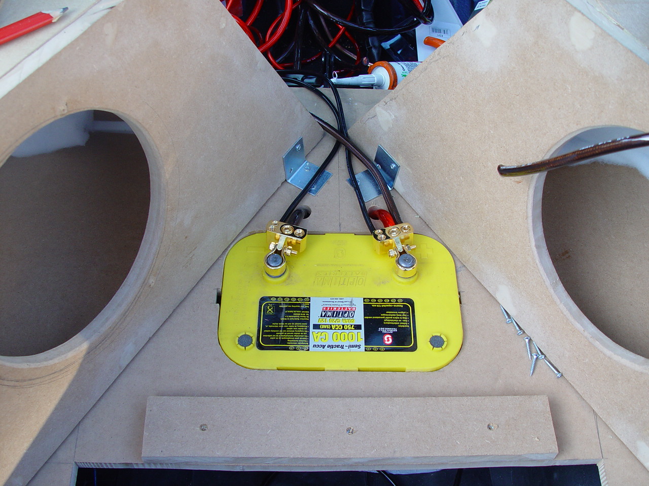 - Your looking at the left side of the trunk and where my 1 farad Phoenix Gold cap is and my distribution network.