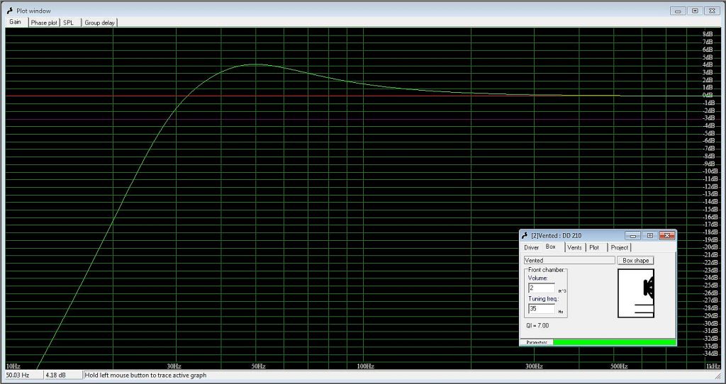 I see you're starting to figure out WINisd. Also note that you can change the box size and port tuning freq. and see what it does to the output on the graph. If it were me, I would probably go with a sealed enclosure. Other wise, you will also have to give up room in the box for the port. You can also change port tuning freq the same way but if you're going with a sealed box, you won't need to do that.