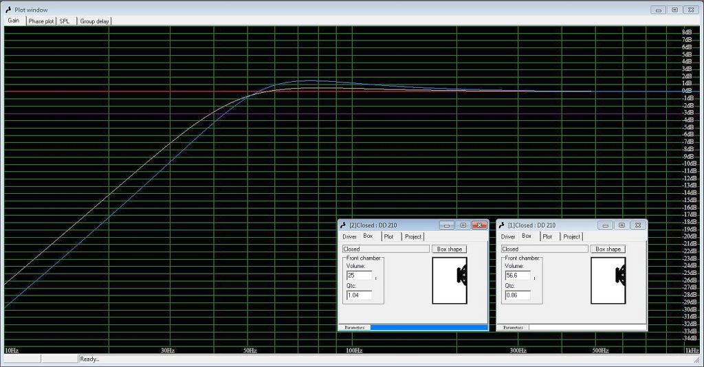 OK...here are two boxes, both sealed (better sound quality normally). One is the same size as the previous box (56.6 l or 2ft^3 WHITE line) and the other is sealed in a 25 Liter box (BLUE line). Not enough gain in either to be worth mentioning. F3 on the WHITE line (2ft^3) box is about 38Hz and the smaller BLUE line (25 liter) box is about 44Hz.
