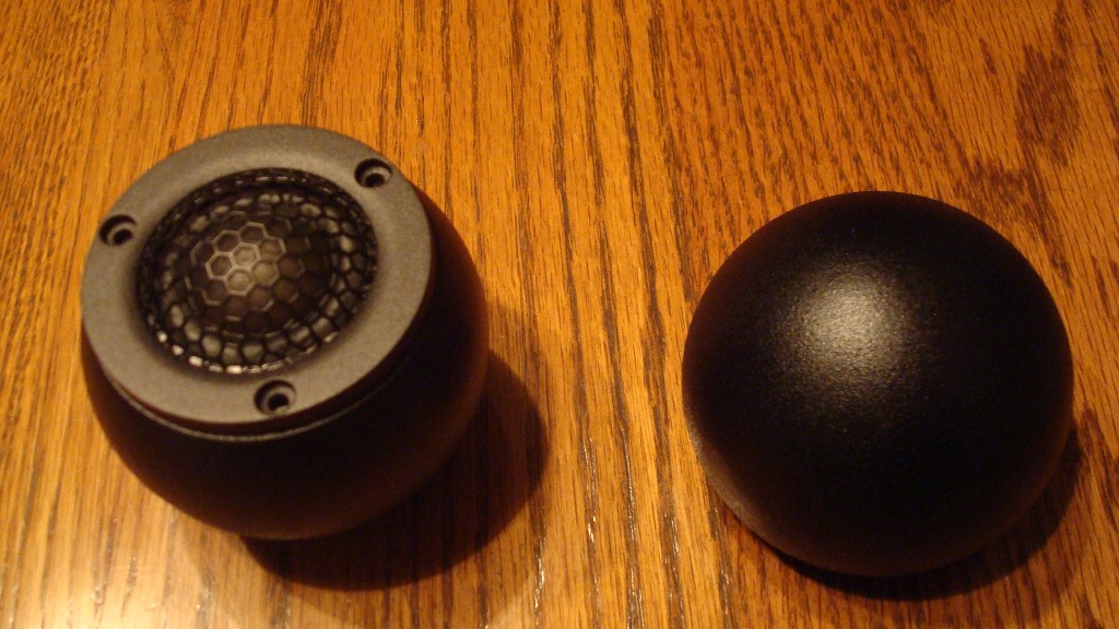 I've also begun work on the tweeter housings. They are made from 3" diameter wooden spheres that I cut and drilled to house the Scanspeak tweeters. They will be painted black and will be mounted using an articulating Ram mount to allow for adjustments later on.