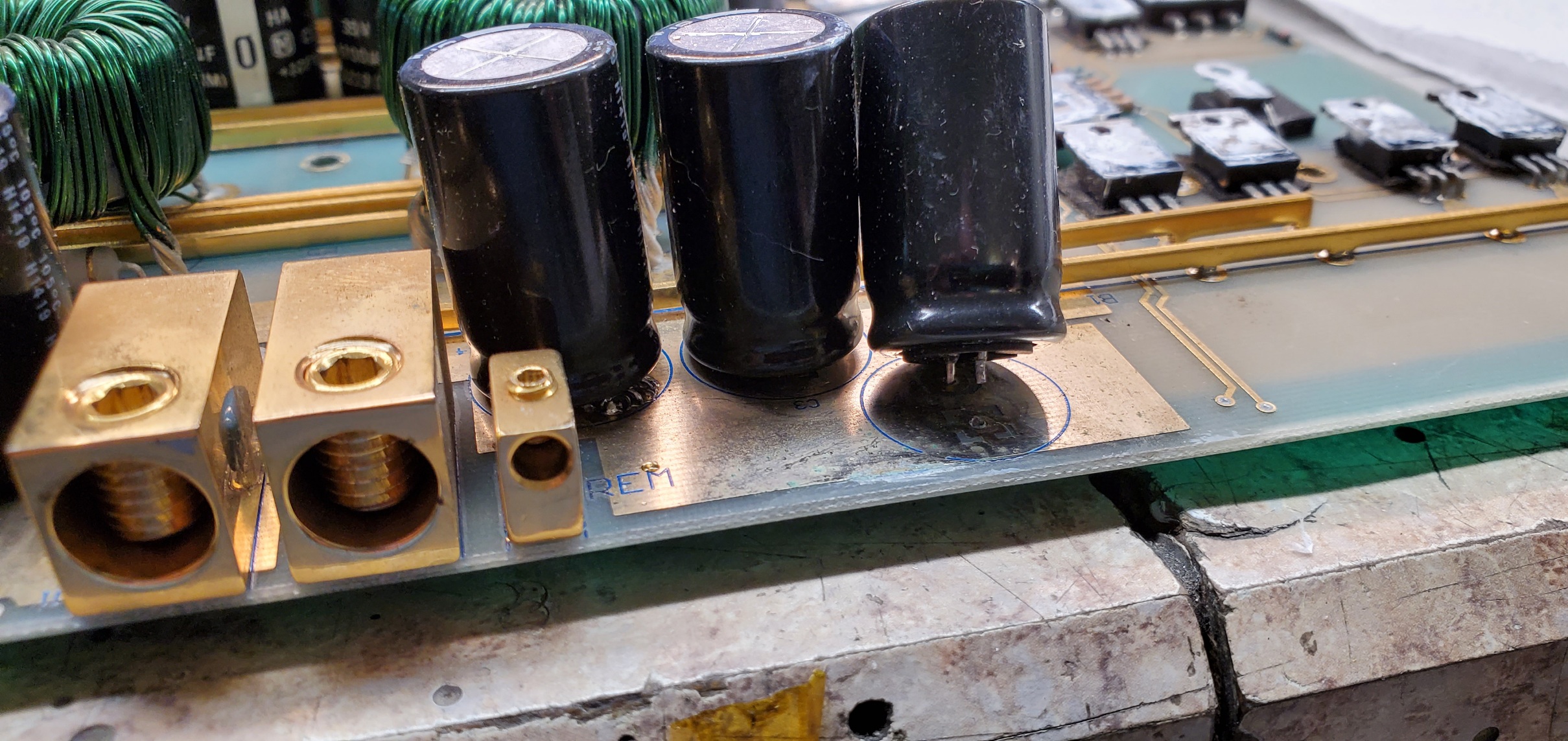 So, the amp shows up in a box in pieces. One of the new caps was cocked off the board. The solder joints were very cold and I could tell from the feel that at least some had pulled plating. So on top of the rest of the repair I had to redo the recap and fix the ripped out plating.
